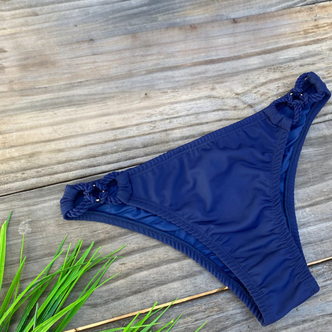 Em azul marinho sofisticado, a calcinha modelo tradicional oferece conforto com estilo. Com argola dourada e cordão torcido na lateral, valoriza a silhueta com charme. Possui ZERO transparência e acabamentos em metal personalizado da marca perfeita para quem busca praticidade sem abrir mão de detalhes que fazem a diferença.
