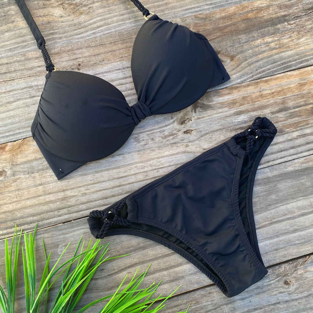 Na cor preta clássica e atemporal, o Biquíni Confort combina elegância e praticidade. O top estruturado com bojo fixo e aro oferece excelente sustentação e valoriza o colo, enquanto as alças com argolas douradas e cordão trabalhado permitem diferentes formas de amarração. A calcinha tanga, com os mesmos detalhes refinados, garante conforto com estilo. Conjunto com ZERO transparência e metais personalizados da marca, ideal para quem busca sofisticação nos mínimos detalhes.