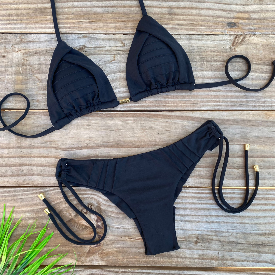 Um clássico com personalidade. O top cortininha recebe frisos artesanais com sobreposição, garantindo charme e excelente sustentação. A calcinha, com laterais ajustáveis e acabamento manual, oferece conforto e caimento perfeito. O bumbum fio duplo e os metais exclusivos da marca finalizam o look com requinte.