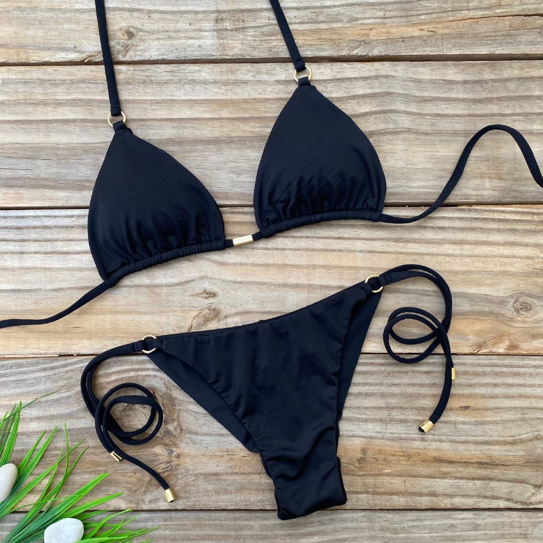 Minimalismo com toque de brilho. O top cortininha com bojo removível e argolas douradas nas alças valoriza o colo com elegância. A calcinha de lacinho, com amarração lateral e detalhes dourados, garante um ajuste perfeito e destaca o bumbum com modelagem fio duplo. Acabamentos refinados em metal personalizado completam este conjunto clássico e atemporal.