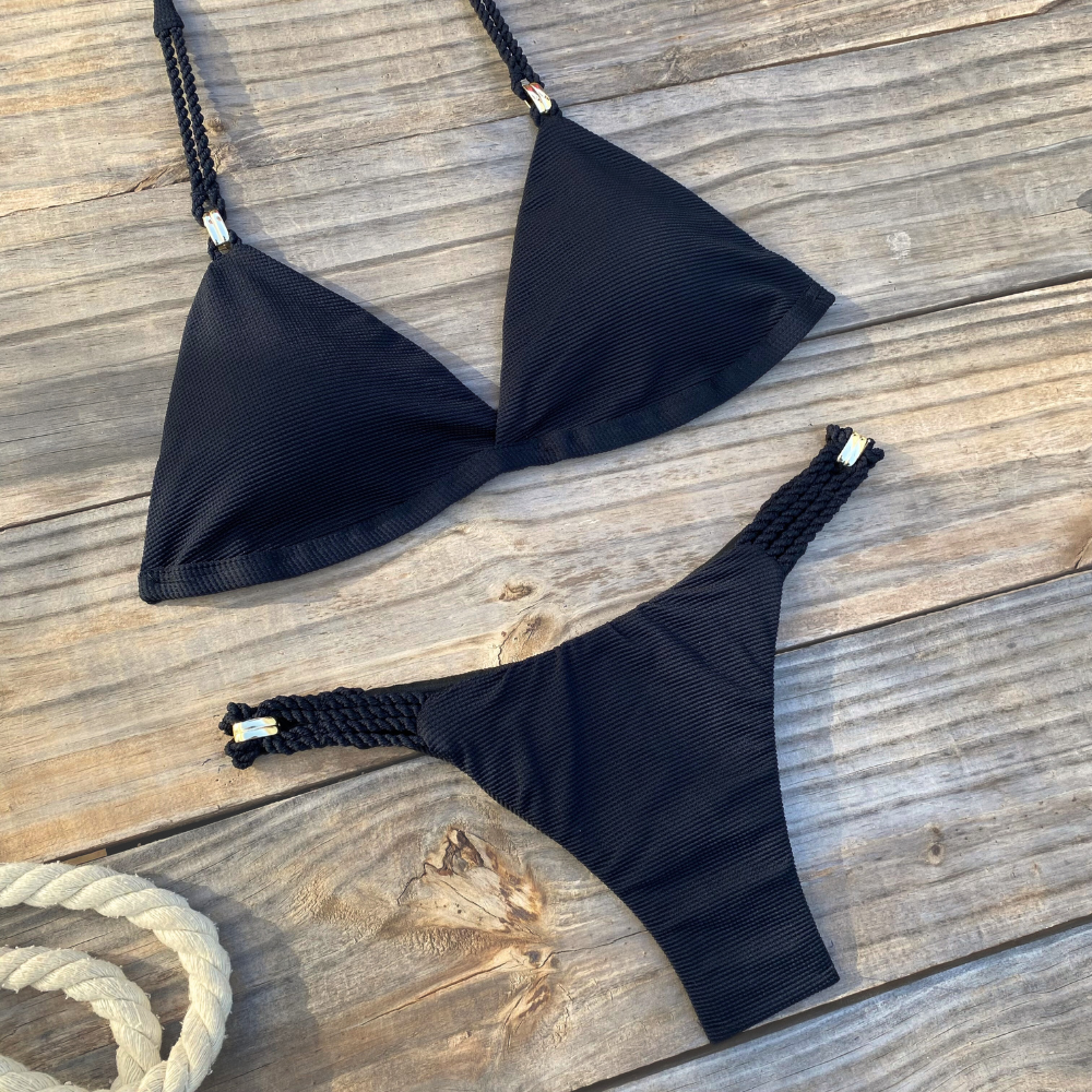 Biquíni Preto Matrix oferece o equilíbrio ideal entre sofisticação, conforto e durabilidade. O top cortininha fixo garante sustentação com ajuste preciso nas costas, além de bojo removível para maior liberdade de uso. As alças em macramê feitas à mão, com detalhe metálico exclusivo, permitem diferentes formas de amarração, adicionando versatilidade ao visual. A calcinha com efeito “UP” valoriza as curvas com laterais em macramê e costuras embutidas para um acabamento impecável. Com metais personalizados, esse modelo é a escolha perfeita para quem busca estilo com autenticidade.