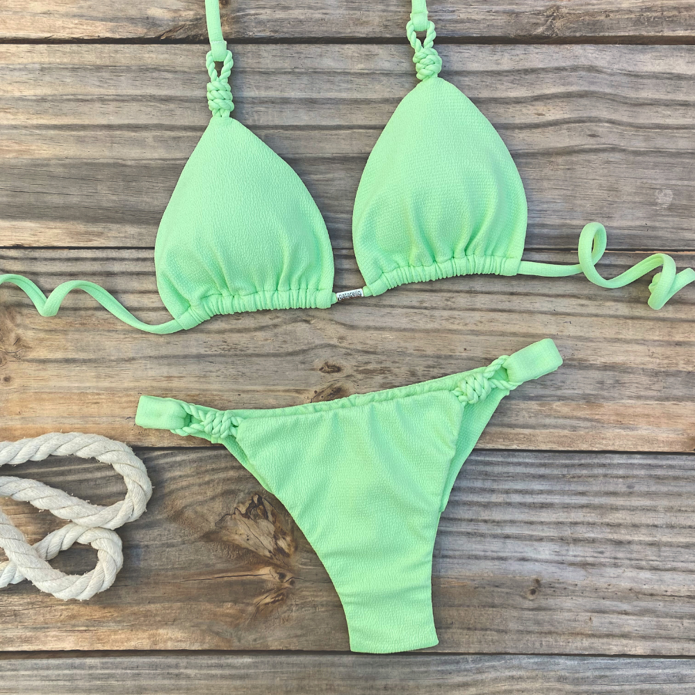 Delicado e exclusivo, este biquíni combina charme artesanal e funcionalidade. O top com alças ajustáveis e detalhes em macramê traz um toque único, enquanto o bojo removível garante versatilidade. A calcinha com regulagem e fio duplo valoriza a silhueta com conforto absoluto — tudo isso com zero transparência. Finalizado com metais personalizados da marca, é a escolha perfeita para quem busca sofisticação com praticidade.
