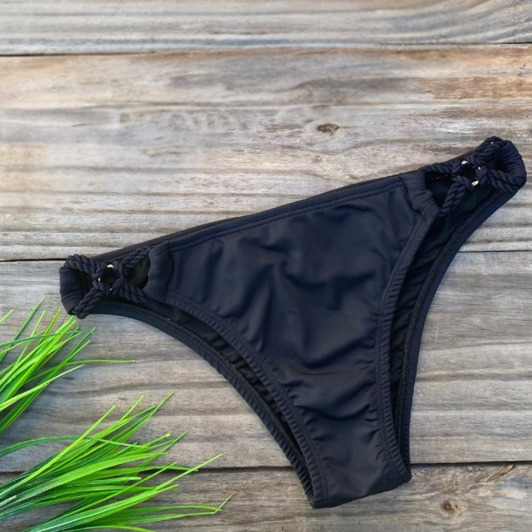 - Calcinha modelo tanga tradicional, com argola dourada e cordão torcido na lateral