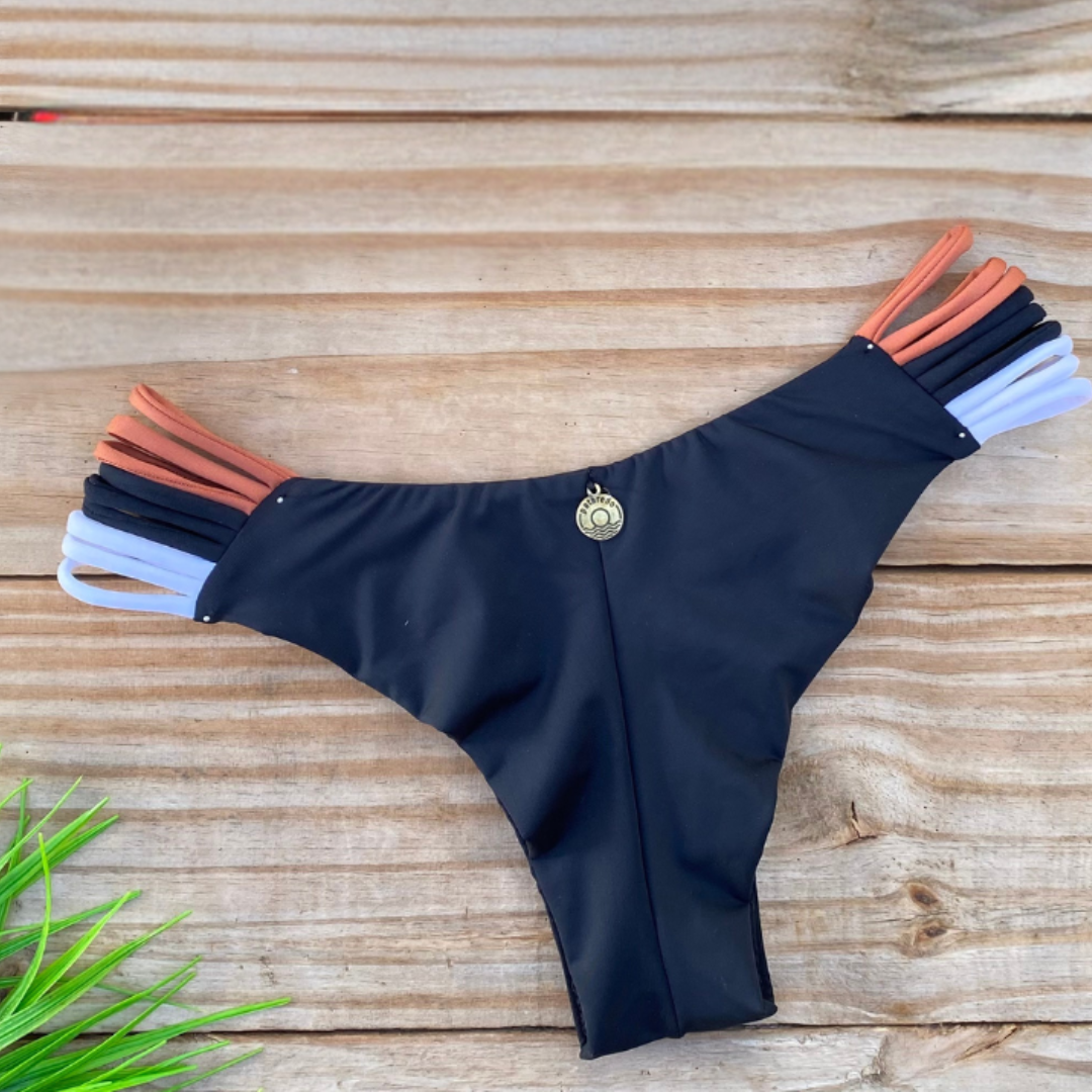 Em tons sofisticados de preto, branco e terracota, esta peça revela elegância e sensualidade em cada detalhe. A calcinha com laterais em tirinhas valoriza as curvas com leveza, enquanto o bumbum fio duplo garante um toque ousado e delicado. Os acabamentos em metal personalizado da marca completam o design com exclusividade e sofisticação.