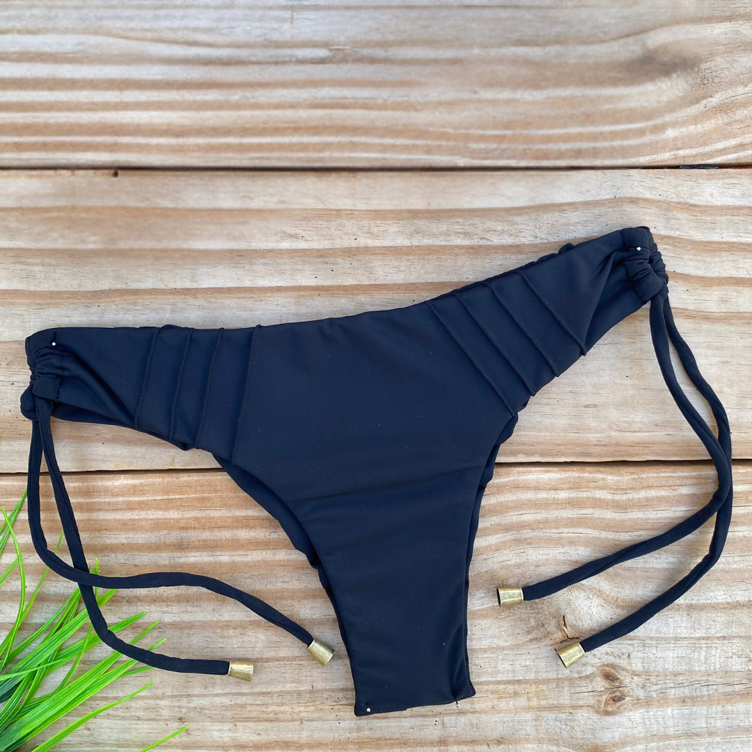 - Calcinha com detalhes de friso feitos à mão, com ajuste nas laterais.