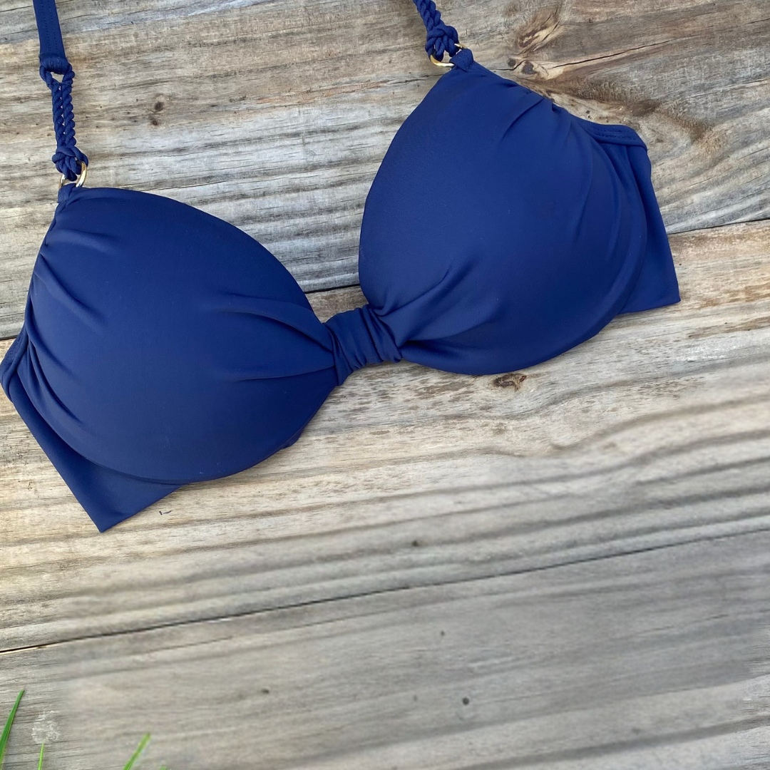 Com bojo fixo e aro para sustentação e realce dos seios, este top azul marinho une conforto e elegância. As alças com argola dourada e cordão torcido oferecem versatilidade, podendo ser amarradas no pescoço ou presas nas costas.